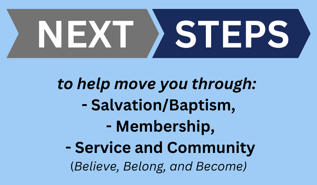 NEXT STEPS will help guide you to a path of full participation in the mission and ministry of Beulah. Our desire is to spend some dedicated time exploring and unpacking important, biblical matters related to salvation, baptism, membership, service, and community.